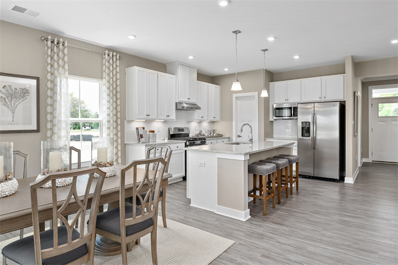 Inside, luxury vinyl plank flooring enhances the main living areas, offering durability and a warm, cohesive look. The upgraded kitchen brings style and functionality together with linen cabinetry, granite countertops, a tile backsplash, a spacious island, and a full suite of stainless steel appliances – including the refrigerator – so you can settle in with ease. The open layout flows effortlessly into the dining area and great room, making everyday feel comfortable and connected.