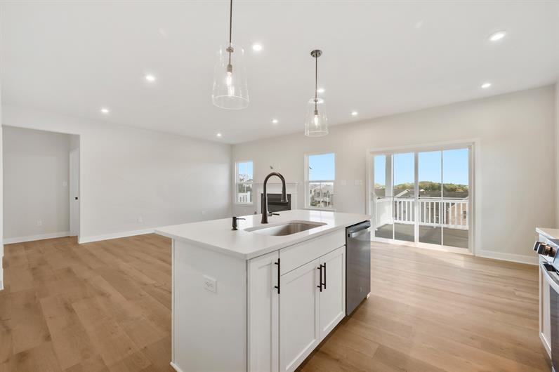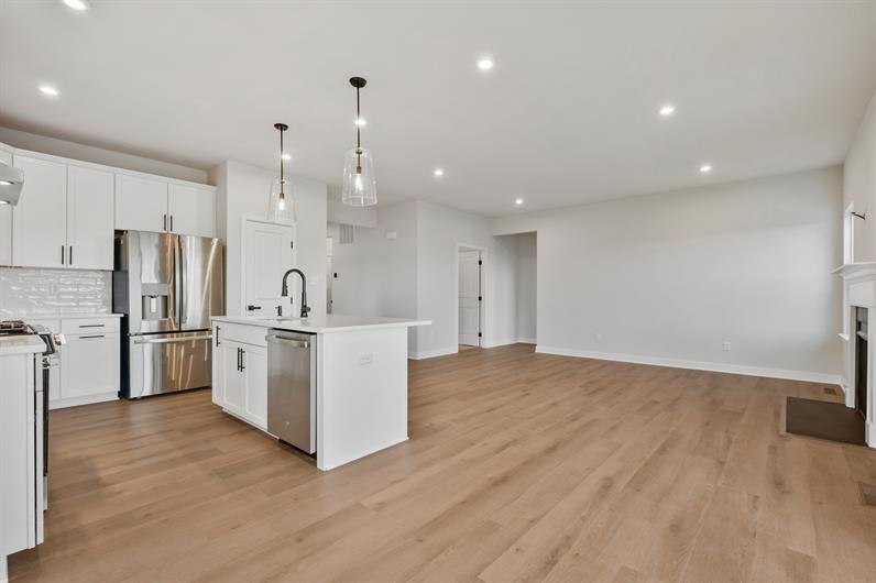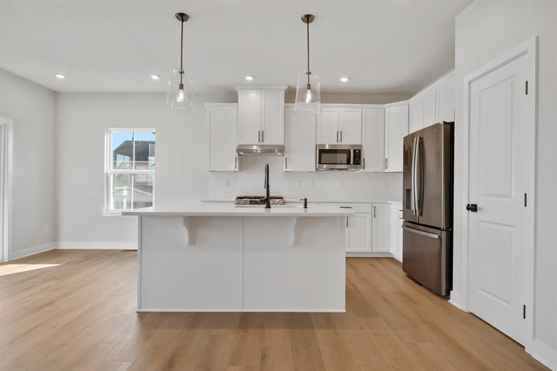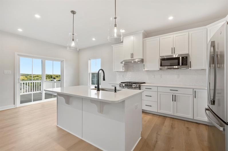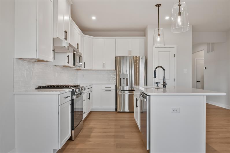 - Gourmet kitchen with large island, quartz countertops, all appliances (with refrigerator), upgraded white cabinetry, hooded vent and tile backsplash