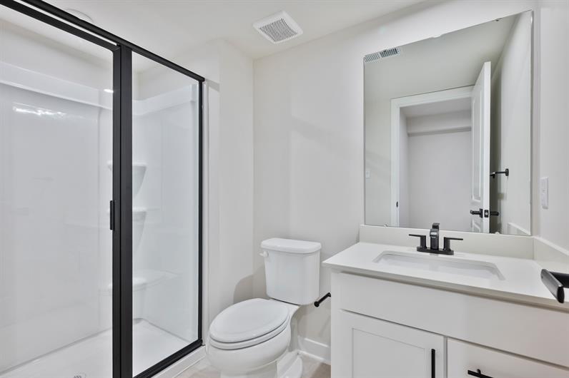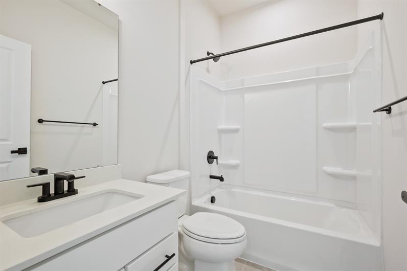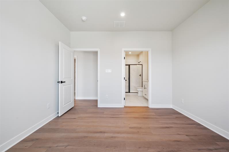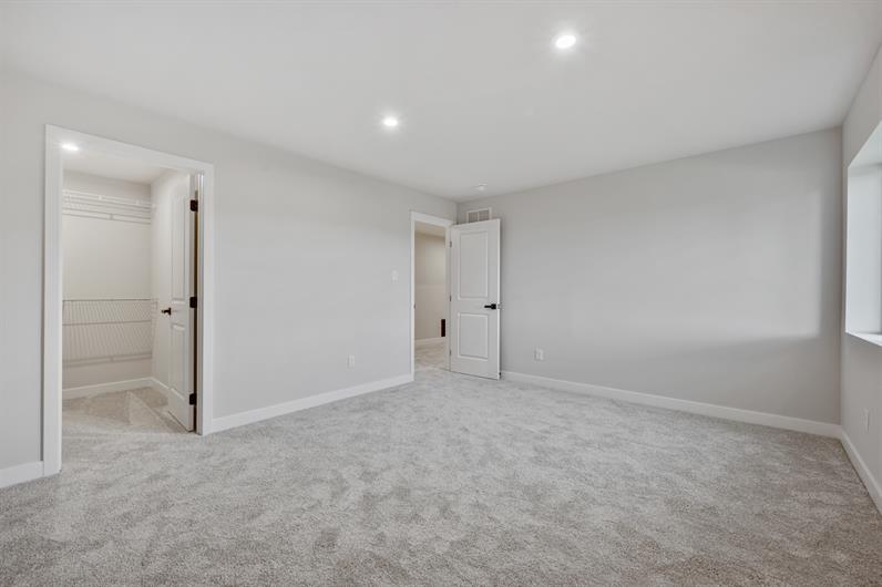 - Spa-like, private owner’s bathroom with Roman shower, dual vanities, quartz countertops and tile surround