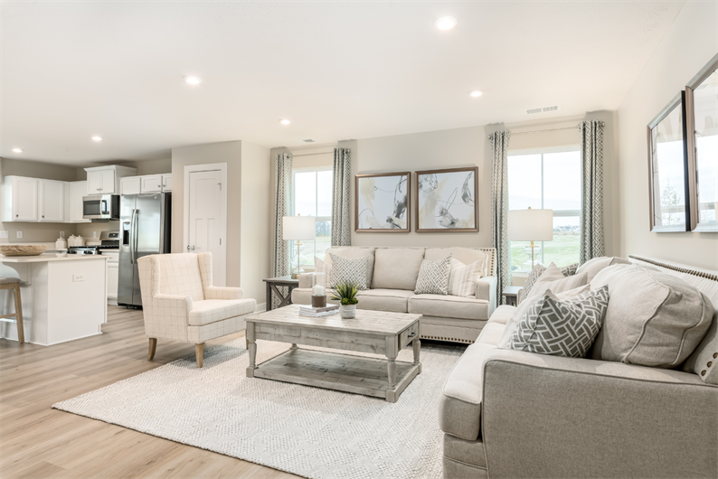 Welcome to Grand Cayman quick move-in home with 3-bedroom, 2-bathroom home offering 1,533 square feet of thoughtfully crafted living space. The heart of the home features a sleek kitchen with white cabinetry, quartz countertops, and all stainless steel appliances included, even the refrigerator. A spacious kitchen island adds functionality and style, perfect for entertaining or everyday living. Enjoy the open-concept layout with luxury vinyl plank flooring throughout the great room, entry, kitchen, and dining areas, enhanced by an upgraded lighting package that creates a warm and inviting atmosphere. The owners suite is a true retreat with a walk-in shower, dual vanities, and wide 3' doorways throughout the home for enhanced accessibility.