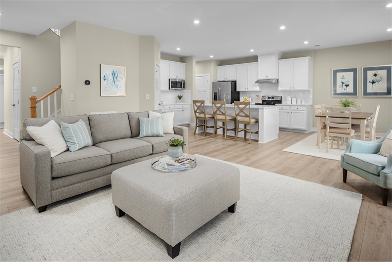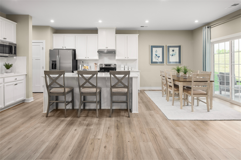 At the heart of the home, the kitchen blends style and function with upgraded linen cabinetry, quartz countertops, a tile backsplash, and stainless steel appliances – including a gas range, dishwasher, and microwave. A spacious kitchen island offers casual seating and extra prep space, opening seamlessly to the main living area for an effortless flow.