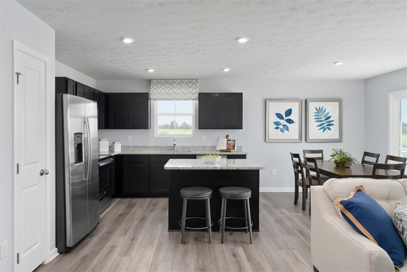 This inviting ranch offers an open-concept layout with a spacious kitchen featuring a large island, upgraded cabinetry, chrome fixtures, and 36" upper cabinets. Enjoy the convenience of a walk-in pantry and included stainless steel appliances - even the refrigerator, washer, and dryer! The living room flows seamlessly into the kitchen, perfect for entertaining. The owner’s suite includes a large walk-in closet, 36" heightened vanities, and a clear glass bypass shower door. Durable luxury vinyl plank flooring runs throughout . Exterior highlights include a partial stone facade and a homesite where fences are allowed. Visit today to learn more!