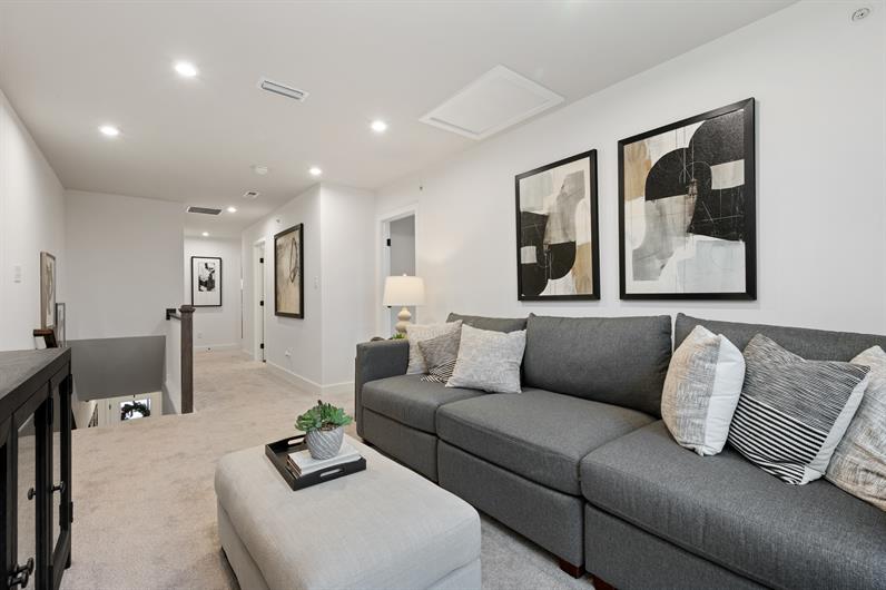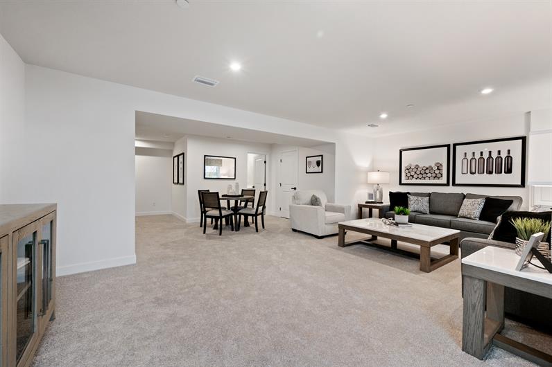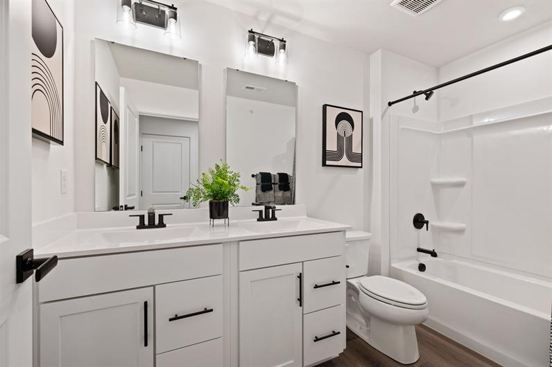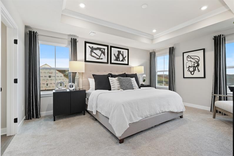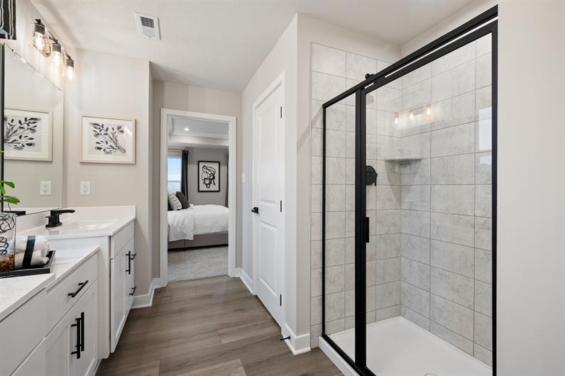 - Owner’s suite with spa-like bathroom featuring a Roman Shower, tile surround, dual vanities and quartz countertops