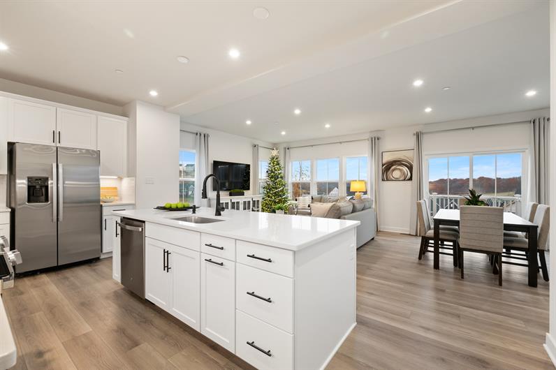 - Gourmet kitchen with large island, quartz countertops, appliances, tile backsplash and chrome fixtures