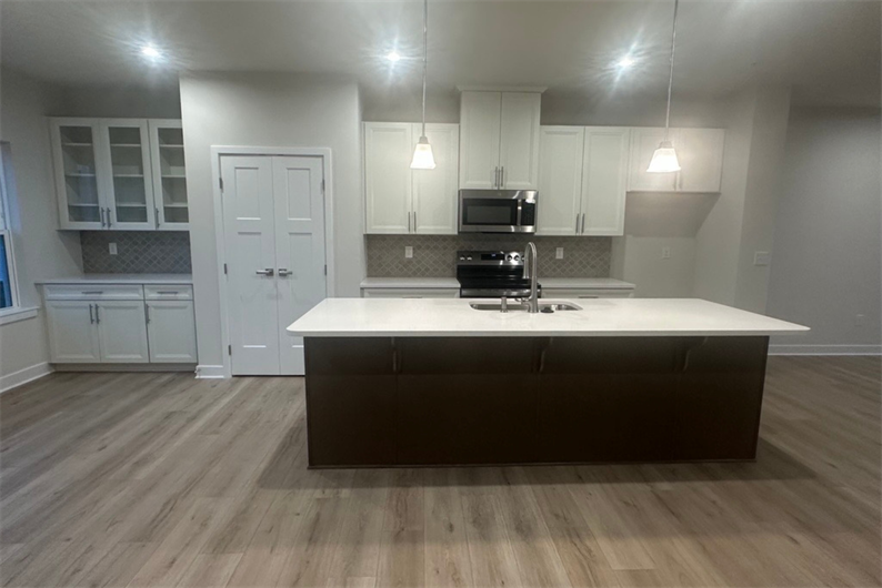 The kitchen is a true centerpiece, featuring upgraded painted vanilla cabinetry paired with a Maple Latte island, white quartz countertops, and a stylish tile backsplash. The spacious island provides room for casual dining and entertaining, while stainless steel appliances (excluding the refrigerator) complete the gourmet look.