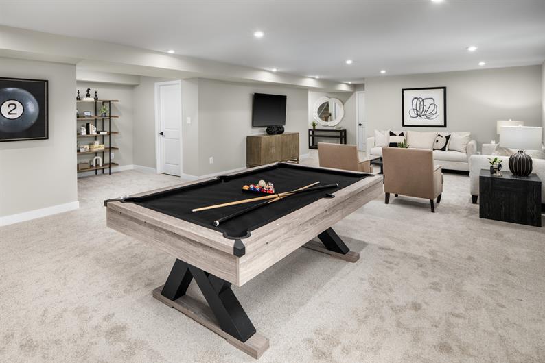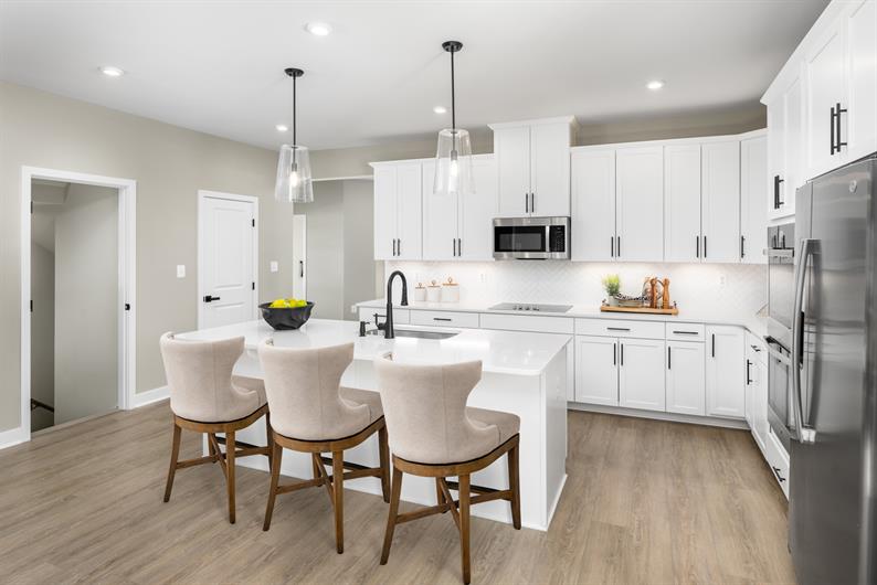 This Rockefeller home has it all, and is ideally set on a homesite that does not face another home. Enter through the 2-car garage or front door into a formal dining room and continue into the open-concept main living area featuring the kitchen, dining room, and living room. Enjoy luxury vinyl plank flooring throughout the first floor, providing an elevated look. The kitchen showcases upgraded white cabinetry, quartz countertops, a tile backsplash, an oversized island, and included stainless steel range, microwave, dishwasher, and hooded vent. Use the finished basement for an entire extra level of living space.
