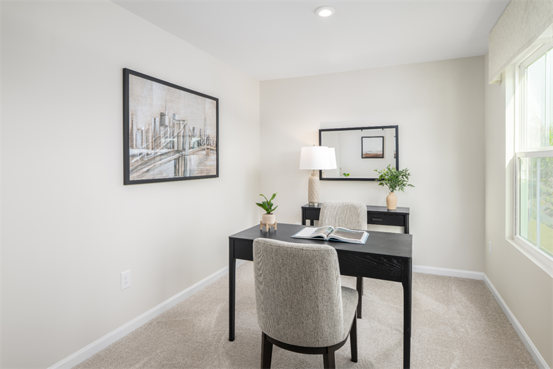 The kitchen is a true centerpiece, featuring upgraded white cabinetry, granite countertops, a large island, chrome fixtures, and stainless steel appliances – including the refrigerator, dishwasher, microwave, and range – so you can start cooking right away. A first-floor guest bedroom and private study offer flexibility for visitors or remote work.
