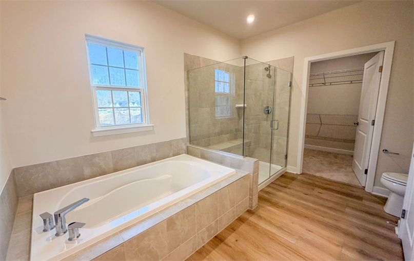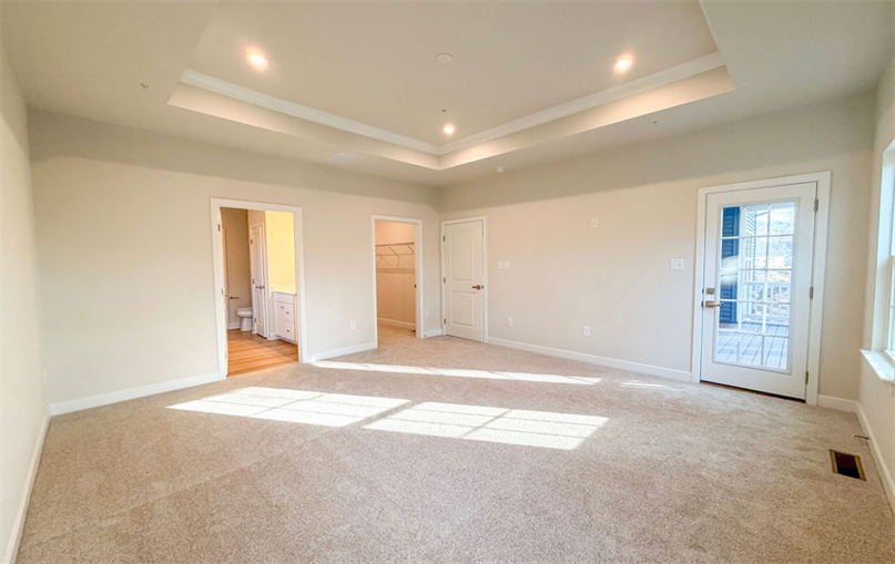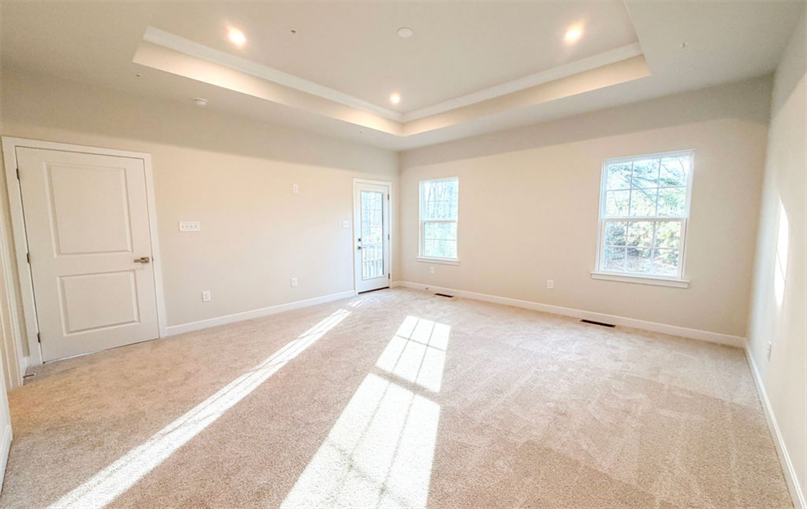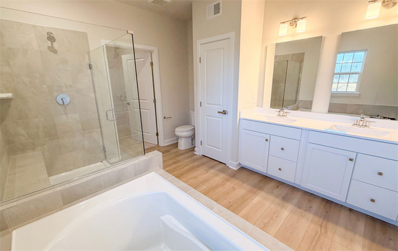 The main-level owner's suite offers true serenity with a tray ceiling, dual vanities, a soaking tub, tile-surround shower, and frameless glass door. A convenience first-floor guest bedroom adds extra versatility for visiting friends and family.
