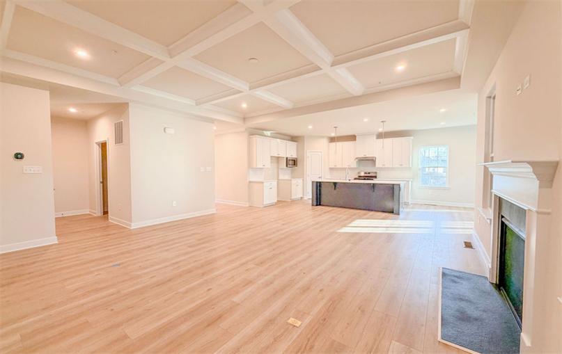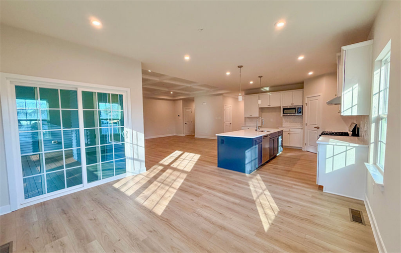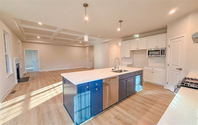 Inside, the open layout showcases luxury vinyl plank flooring, a coffered ceiling in the living room, and a dedicated office/study for work-from-home flexibility. The gourmet kitchen stands out with painted linen cabinetry, a navy accent island, quartz countertops, hooded vent, soft-close upgrades, and stainless steel appliances (except for the refrigerator). Chrome fixtures and a spacious island make this the perfect gathering space for cooking and hosting.