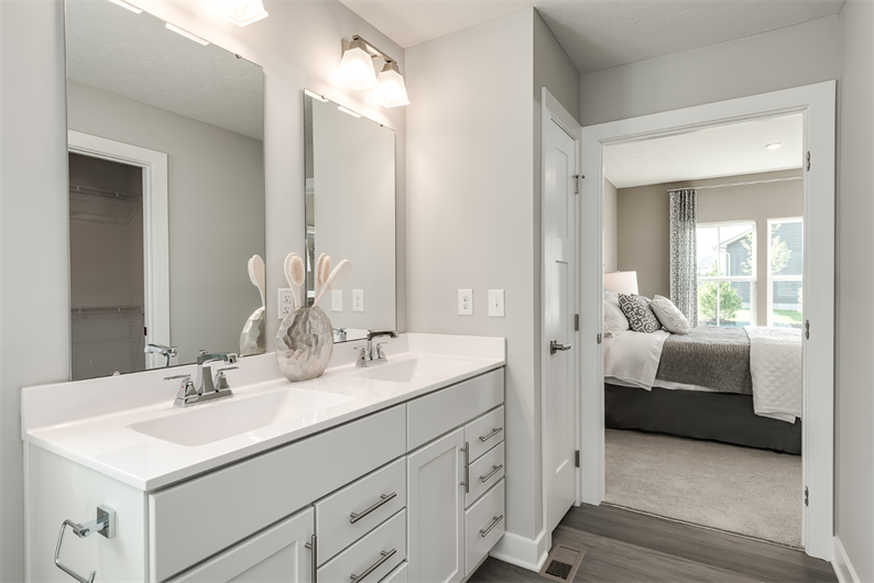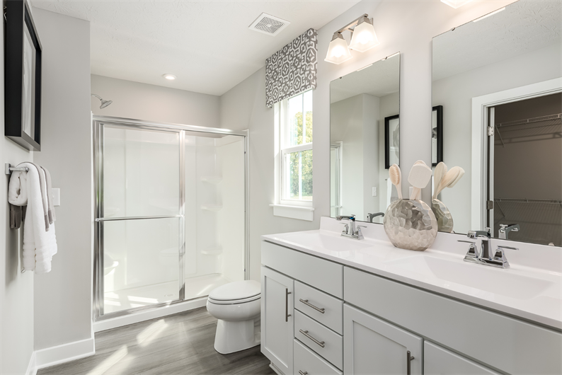 The owner's suite offers a peaceful retreat, complete with dual vanities and a beautifully finished tile shower surround that elevates everyday routines. Thoughtful separation between the main living areas and private spaces allows for quiet moments when needed, while still keeping everything conveniently within reach.