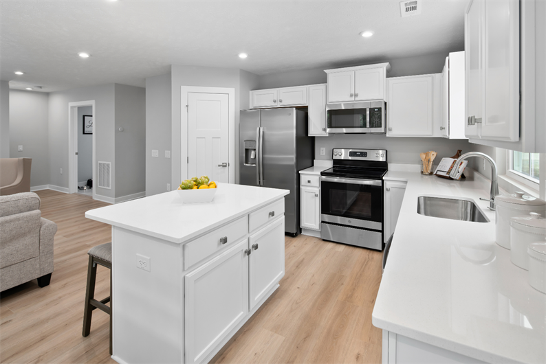 Step inside to an inviting open-concept floor plan featuring luxury vinyl plank flooring throughout the main living areas. The spacious kitchen is a chef’s delight, boasting sleek quartz countertops and included appliances, even the refrigerator! You can even take your dinner parties outside on the included rear patio. The owner’s suite is a private retreat with a walk-in shower, dual vanities, and ample space to unwind. Two additional bedrooms, including a first-floor guest bedroom, offer flexibility for visitors or hobbies.