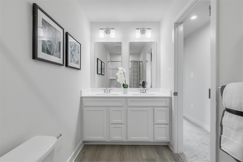 Upstairs, two large bedrooms share a full bath and convenient laundry, while the primary suite offers a spa-like retreat with a dual vanity bath and a generous walk-in closet.