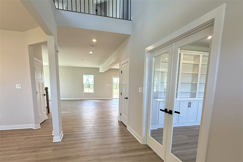 Step inside to find luxury vinyl plank flooring throughout the main level, a formal dining room, and a private study with French doors and built-in bookcase. The gourmet kitchen is a showstopper, featuring painted vanilla cabinetry, quartz countertops, tile backsplash, a double wall oven, gas cooktop, and matte black fixtures. A large maple latte island provides extra prep space and seating.