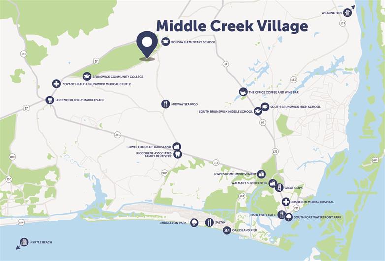 Situated off Old Ocean Highway, Middle Creek Village puts you in the center of it all without the congestion. Enjoy endless entertainment and shopping options nearby, including the new Midway Commons Plaza with Lowes Foods and local eateries. Or take a quick trip to Oak Island and Southport for seaside fun & entertainment. Enjoy a day by the water, local farmer's markets, and live music. With easy access to Route 17, a trip north to Wilmington or south to Myrtle Beach, SC, will be a breeze.