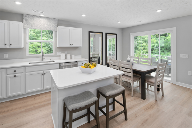 Inside, the open-concept layout is both welcoming and refined. Luxury vinyl plank flooring flows throughout the main living areas, creating a cohesive and easy-care foundation. The gourmet kitchen is thoughtfully designed with linen-colored upgraded cabinetry, quartz countertops, a tile backsplash, and a full suite of included appliances – even the refrigerator. A central kitchen island provides the perfect spot for casual meals, entertaining, or simply catching up over coffee.