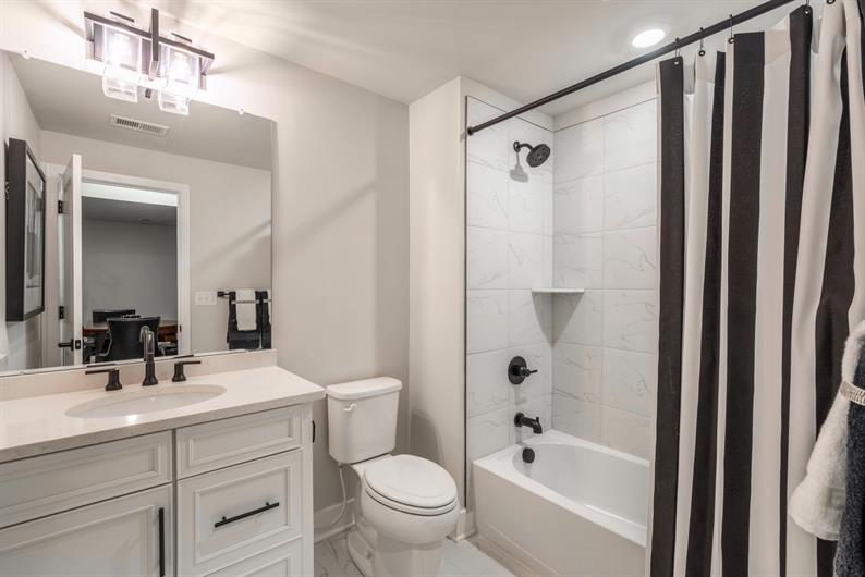 The open-concept main level features luxury vinyl plank flooring and a beautifully upgraded kitchen with linen-colored cabinetry, quartz countertops, tile backsplash, stainless steel appliances (refrigerator included), and a large center island ideal for entertaining. The spacious first-floor owner's suite includes a private bath with dual vanities and a tile shower surround, while a first-floor guest bedroom provides flexibility for visitors or hobbies.
