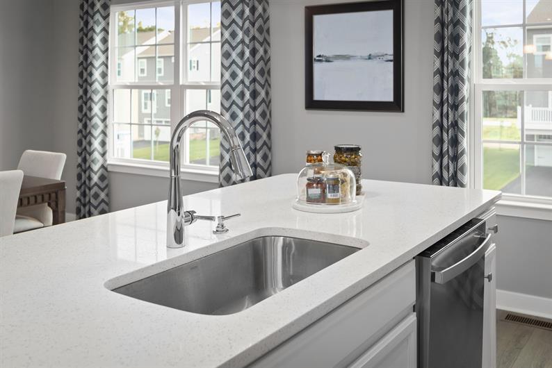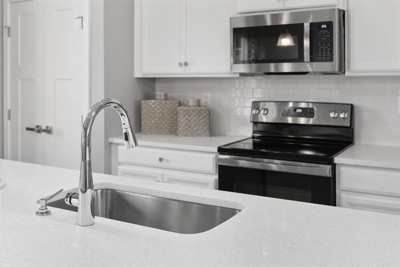 - Gourmet kitchen with quartz countertops, white painted linen cabinetry and included appliances (without refrigerator)