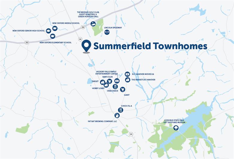 Located just 5 minutes to Hanover and 20 minutes to Gettysburg, Summerfield is conveniently located to shopping, dining and just a short drive to York, Baltimore, Westminster, and Frederick, MD.