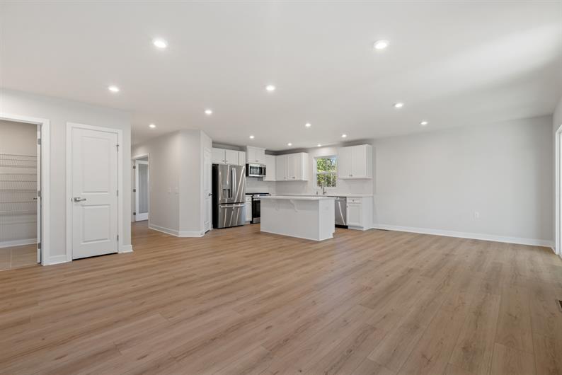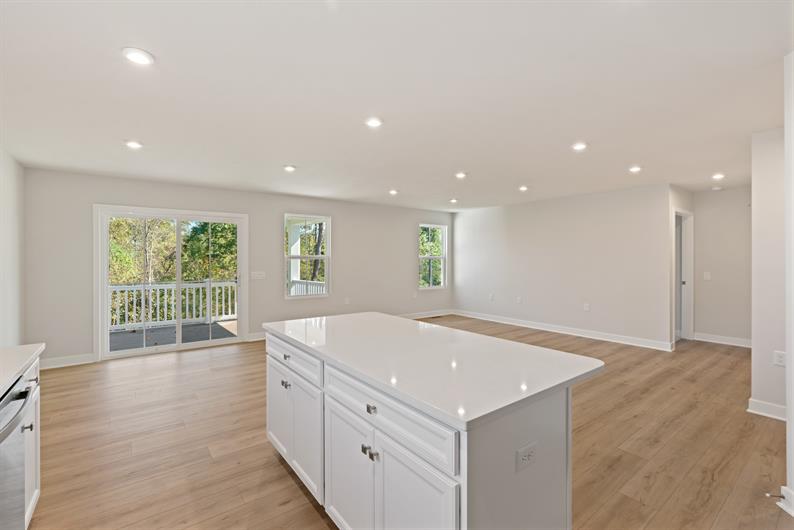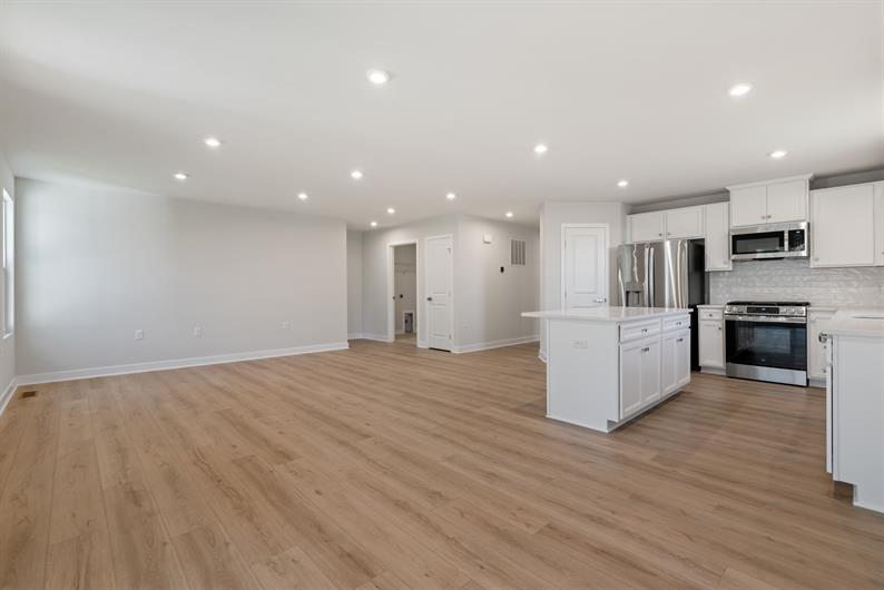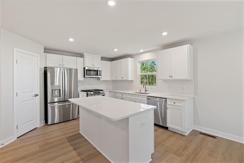- Gourmet kitchen with island, Frost White quartz, all stainless-steel appliances included (with refrigerator) and tile backsplash