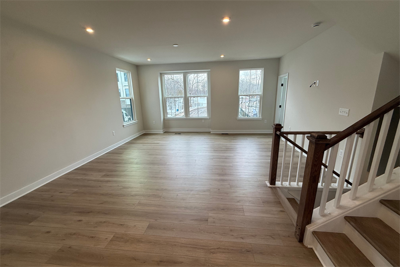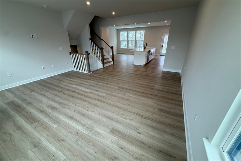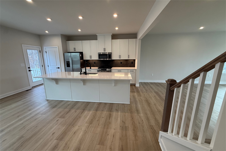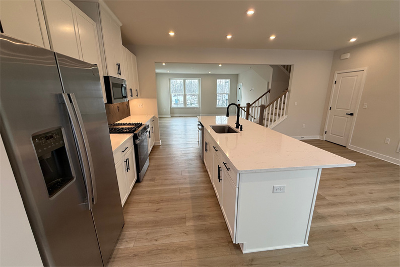 This end-homesite McPherson stands out with additional natural light from five extra windows and a premier corner homesite with no rear neighbors and beautiful wooded views. Enjoy a striking partial stone façade and your own driveway leading to the spacious 2-car garage. Enter through the garage or the welcoming foyer into the first-floor finished rec room, complete with a full bathroom – perfect for guests, a home office, or a media space. Head upstairs to the bright and open main level, where the kitchen, dining room, and living room flow together seamlessly. The kitchen features upgraded white cabinetry, quartz counters, a stylish tile backsplash, black fixtures, and all included stainless steel appliances. Step right out onto your rear deck and take in the wooded backdrop with no rear neighbors. Luxury vinyl plank flooring and a convenient powder room complete this level.