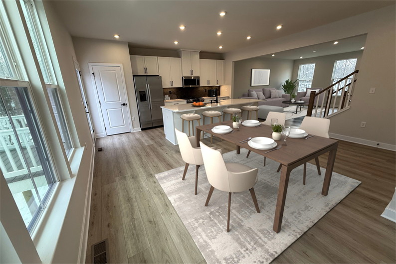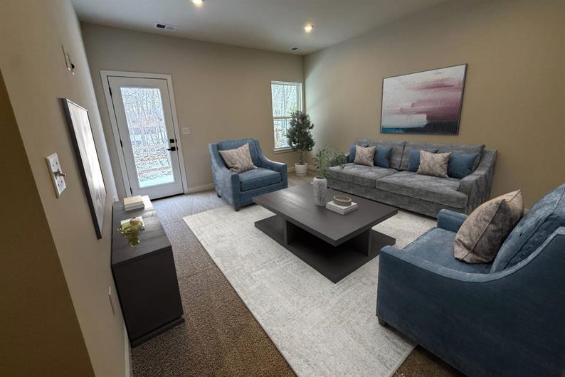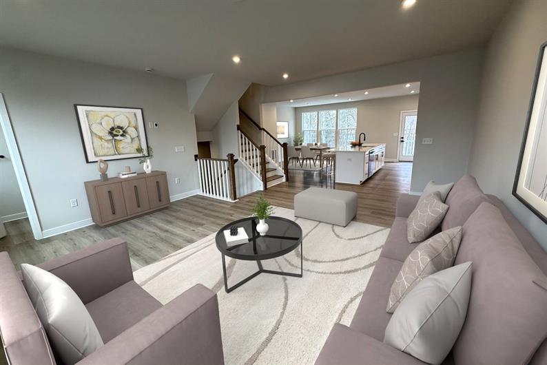 This McPherson townhome offers the perfect blend of comfort and sophistication, set on a wooded homesite with no rear neighbors. Enter through the convenient 2-car garage or welcoming foyer into a fully finished first-floor recreation room complete with a full bathroom, ideal for guests, a home office, or a hobby space. Upstairs, natural light fills the airy main level where the kitchen, dining area, and living room flow together seamlessly. The upgraded kitchen features white cabinetry, quartz countertops, a stylish tile backsplash, black hardware, and all included stainless steel appliances – refrigerator and oversized island included. Step out onto the 8'x8' rear deck overlooking mature trees, perfect for morning coffee or evening relaxation. Luxury vinyl plank flooring and a powder room elevate the main level even more.