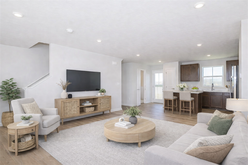 The main level features a spacious kitchen with white cabinetry, a large central island, stainless steel appliances, and stylish LVP flooring that flows seamlessly throughout the space. The open-concept design connects the kitchen, dining, and living areas, creating a warm and inviting atmosphere.
