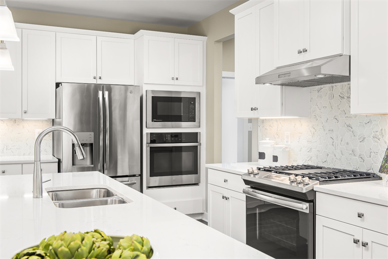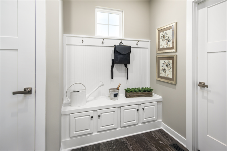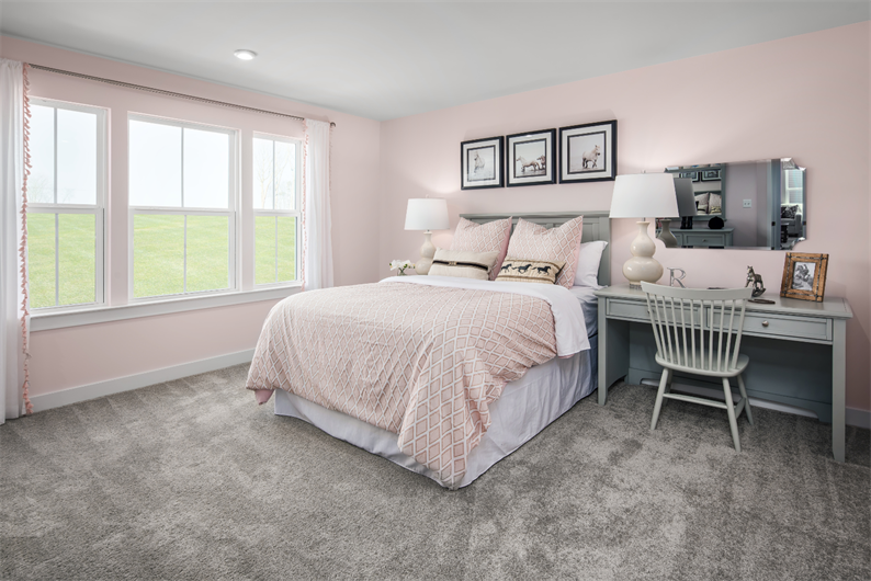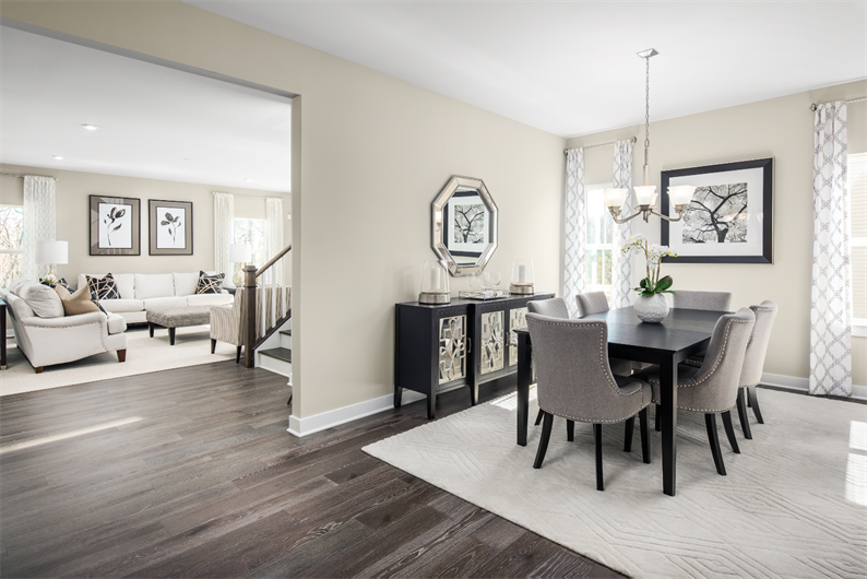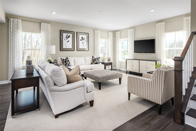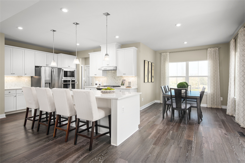 Step into the foyer and enjoy luxury vinyl plank flooring that flows through the kitchen, dining room, family room, and powder room. The kitchen features quartz countertops, a spacious island, linen cabinetry, included stainless steel appliances (refrigerator included), and a gas range hookup.