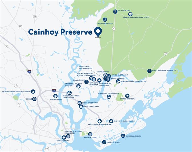 At Cainhoy Preserve, everything you need is close by. Located off Clements Ferry Road near I-526, you’re just 20 minutes from Mount Pleasant and under 45 minutes from downtown Charleston. Wondering where to shop, dine and enjoy the salty air? Explore local favorites below.