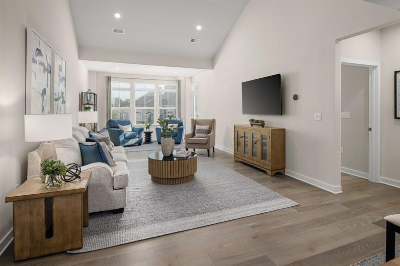Discover luxury living in Mount Olive Township, NJ, at Mount Olive Grove Carriages – the lowest-priced new construction carriage homes in Morris County with first-floor owner's suites nestled within a charming wooded enclave. Our beautifully designed carriage homes offer a sleek, modern open layout featuring a chef’s kitchen with quartz countertops, 42” upper cabinetry, stainless steel appliances, and a breakfast bar – perfect for hosting dinner parties. The spacious great room, with its soaring vaulted ceiling, is ideal for holidays, game nights, or movie nights.