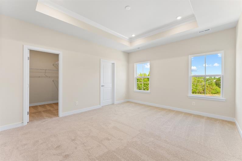 Upstairs, enjoy two spacious secondary bedrooms, a full hall bath, and a private owner’s suite featuring an elegant tray ceiling, a large walk-in closet, and a spa-inspired bath with tile surround and bench seat. Additional highlights include a second-floor powder room, convenient upstairs laundry, and 9-foot ceilings on both the second and third floors, creating an open, airy feel throughout the home.