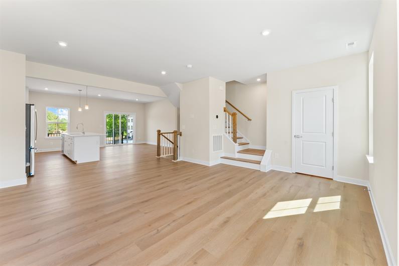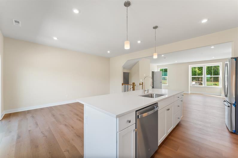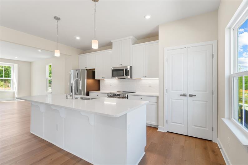 This end-unit, quick move-in Mendelssohn townhome blends the low-maintenance ease of townhome living with the space and comfort of a single-family home—enhanced by a beautifully upgraded design package throughout. The main level features an expansive kitchen with island that opens to a bright, open living area, ideal for entertaining. The kitchen is upgraded with quartz countertops, upgraded cabinetry, a stylish tile backsplash, and stainless steel appliances, including a slide-in range and upgraded refrigerator. Hard-surface flooring throughout the first and second floors and upgraded LVP stairs add durability and modern appeal.