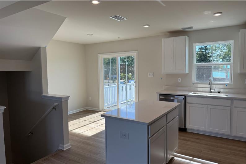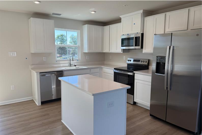 Inside, you’ll find a bright and open kitchen with white cabinetry, a spacious kitchen island, and included stainless steel appliances—perfect for everyday living and entertaining. The composite deck off the main level extends your living space outdoors, ideal for morning coffee or evening relaxation.