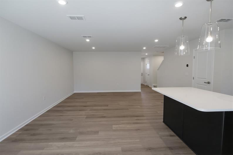 The wide-open great room flows seamlessly into the kitchen and light-filled dining area, where an island provides extra storage and counter space.
