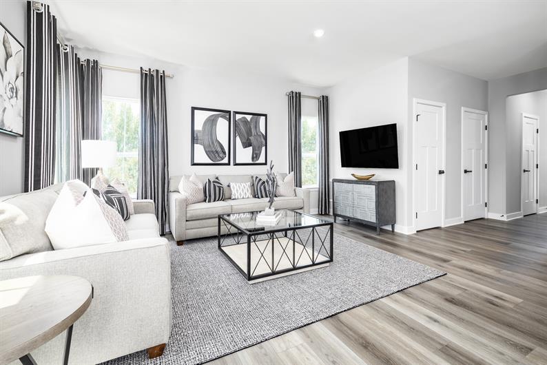 Enter through the attached garage or foyer into an open-concept main level where the kitchen, dining area, and living room flow seamlessly together. Luxury vinyl plank flooring and a powder room complete the space. The kitchen showcases upgraded white cabinetry, a tile backsplash, and quartz countertops.