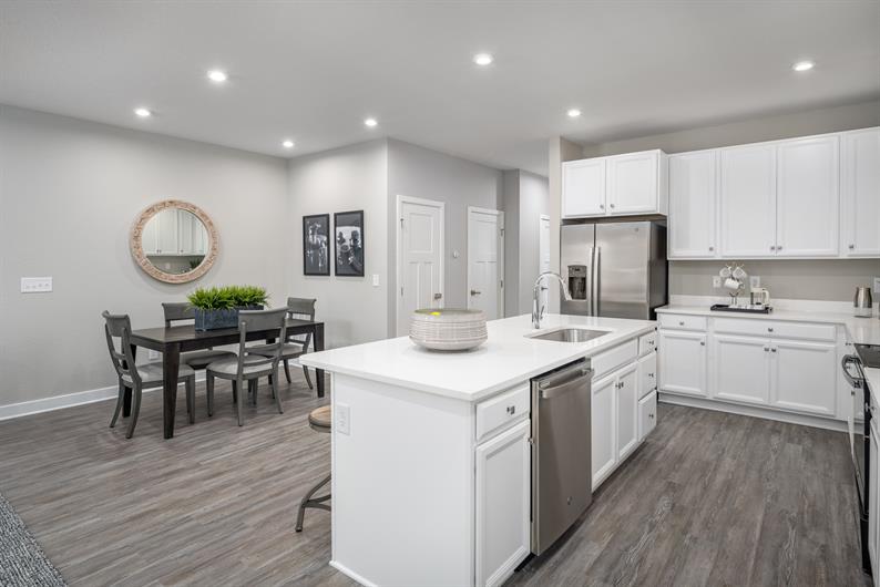 The open-concept main level includes luxury vinyl plank flooring, a powder room, and a bright kitchen with upgraded white cabinetry, quartz countertops, tile backsplash, and all appliances included, plus washer and dryer. The 1-car garage provides easy and direct access to the main level.