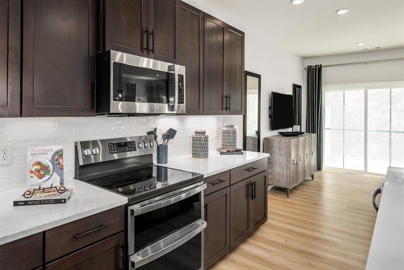 The open-concept main level features luxury vinyl plank flooring, a powder room, and a bright kitchen with upgraded brown cabinetry, a spacious kitchen island, and included stainless steel range, microwave, and dishwasher. The attached 1-car garage provides easy and direct access to the main level.