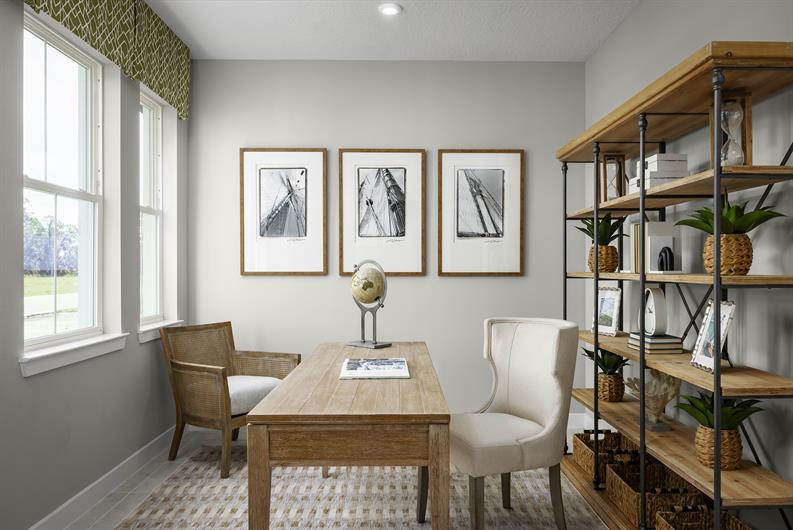 Perfectly proportioned for Florida living, The Brooks delivers the ideal blend of space and versatility. Enter through a welcoming front porch to discover airy 9’ ceilings that flow through the main living areas. This showstopping kitchen features an expansive 8’9” island that seamlessly connects to the dining and great room – all brightened by a dramatic wall of rear windows. The owner’s suite is a true retreat, featuring a spa-like bathroom with dual vanities and generous storage including a walk-in closet. Choose from four bedrooms or transform one into a private study. The spacious lanai extends your living space outdoors, capturing that sought-after Florida lifestyle. Available in two eye-catching elevations with optional stone accents and decorative siding. Thoughtfully designed with extra windows and smart storage throughout, The Brooks proves that the perfect home is all about balance.